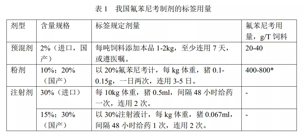 目前在我國市場上用于豬的氟苯尼考產品主要有三種類型,各標簽規定劑量見下表1。