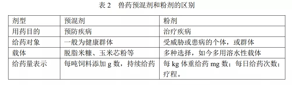 氟苯尼考在低劑量抑菌,高劑量則呈殺菌作用。因此既可作為預防藥,也能作治療藥。相應地,市場上同時有預混劑產品和粉劑產品。預混劑和粉劑都可用于群體混飼給藥,但產品生產工藝、給藥目的頗不相同(詳見表 2),這是導致氟苯尼考用藥劑量差異的主要原因。