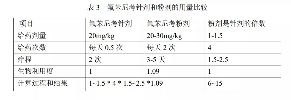 雖然人們能夠理解預混劑和粉劑的用量差別,但氟苯尼考的預混劑和粉劑的差別如此懸殊,還是令人驚訝和不解。