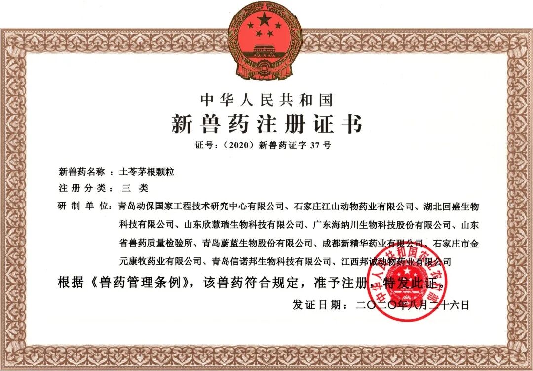2020年8月28日,回盛生物剛剛上市后僅僅過了4天,農業農村部發布第327號公告,批準湖北回盛生物科技有限公司等11家單位聯合申報的“土苓茅根顆粒”為三類新獸藥,核發《新獸藥注冊證書》,證書編號:(2020)新獸藥證字37號。截至目前,回盛生物已經獲批國家新獸藥注冊證書11項 ,其中包括二類新獸藥證書6項、三類新獸藥證書4項。