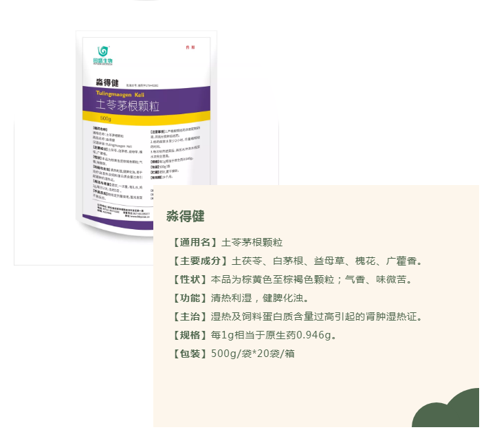 《本草綱目》記載:“土茯苓,有赤白二種,入藥用白者良”。回盛淼得健精心選用道地藥材,其有效成分含量高,使用安全、綠色無藥殘,在治療家禽腎腫和痛風的臨床應用中有療程短、見效快、治愈率高、無毒副作用等特點,深受廣大養殖從業者的喜愛。