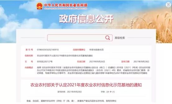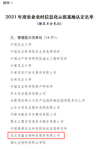 近日,農業農村部公布2021年度農業農村信息化示范基地名單,武漢回盛生物科技股份有限公司入選。