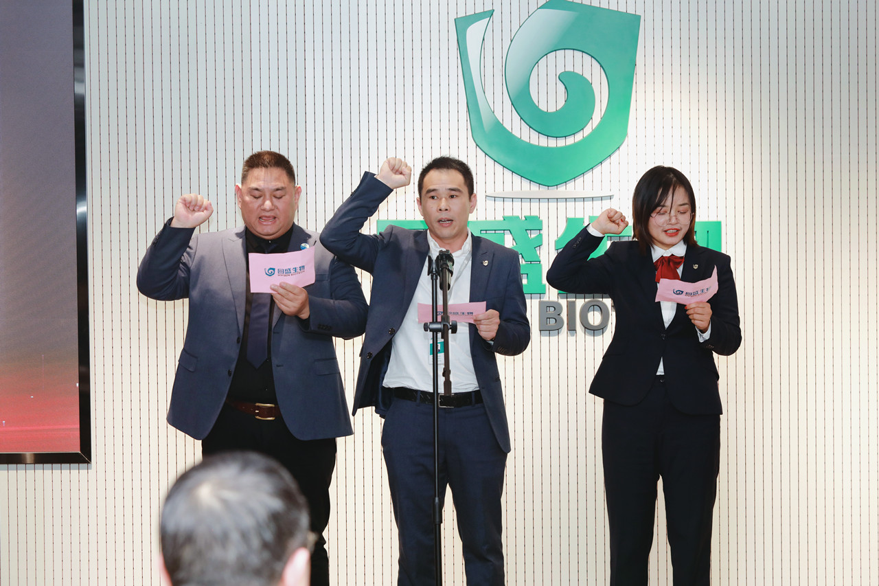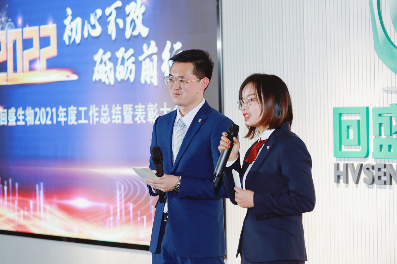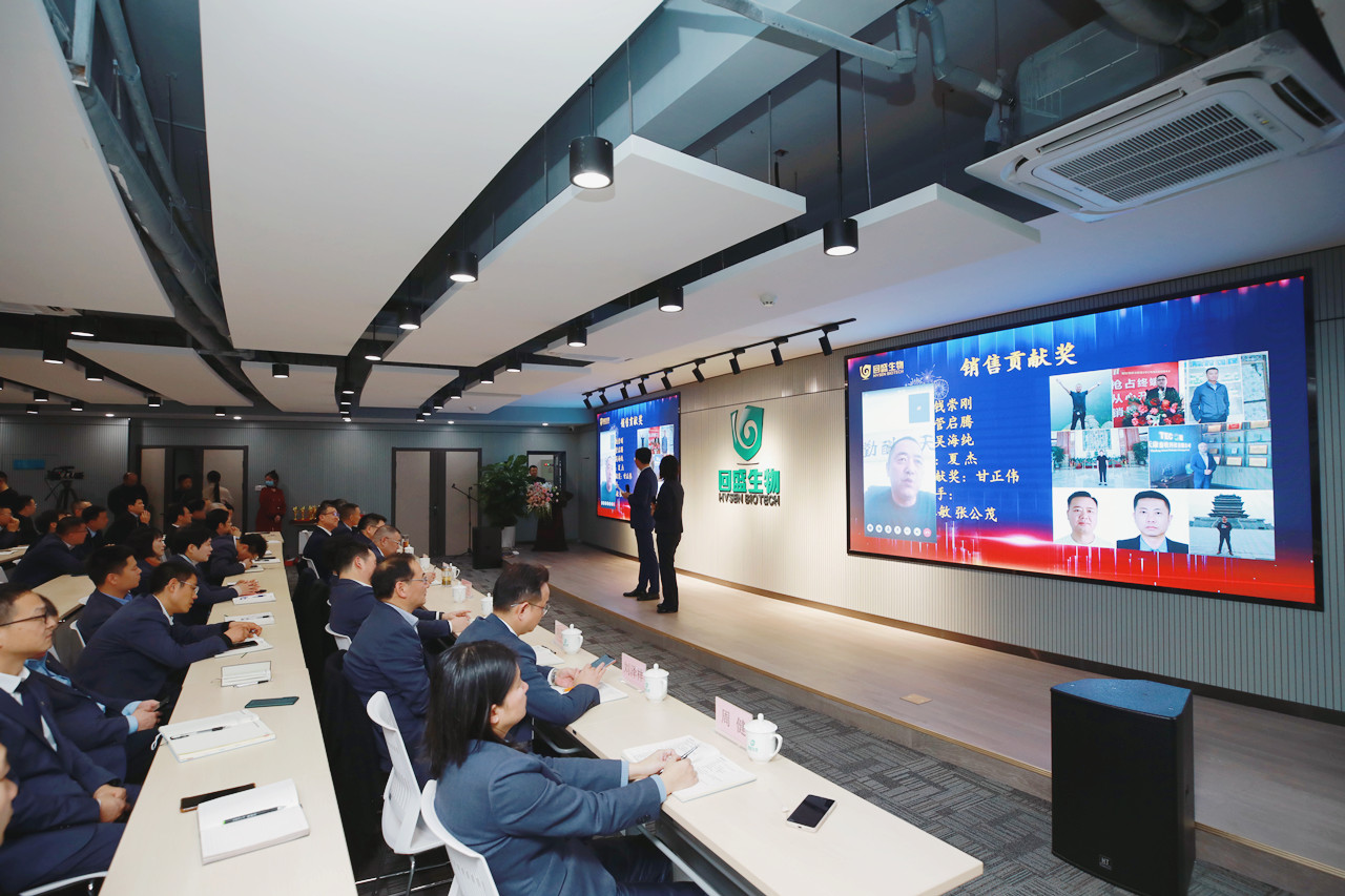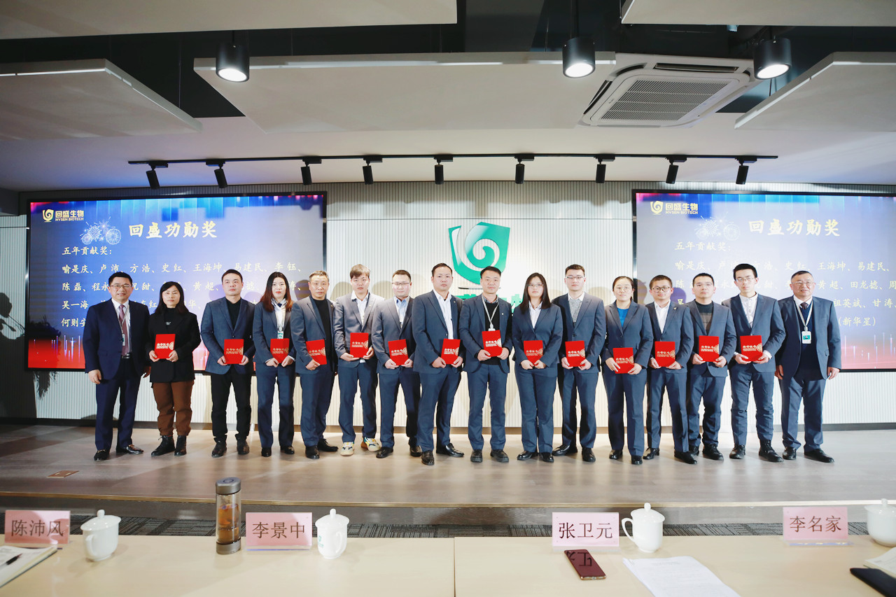 2022年1月21日下午,回盛生物2021年度工作總結暨表彰大會在新溝智能化工廠學術報告廳隆重召開,表彰先進樹楷模,凝聚共識促發展。公司董事長張衛元、首席顧問李名家、回盛公益大使李景中;回盛生物首席科學家、華農-回盛研究院院長周銳教授、外聘專家李自力、宋云峰等6位教授;回盛生物高管團隊、各中心(部門)負責人以及各部門員工代表出席大會。根據疫情防控要求,表彰總結大會首次采用現場會議與線上直播相結合的形式舉辦,各子公司員工通過線上形式觀看了全場直播。