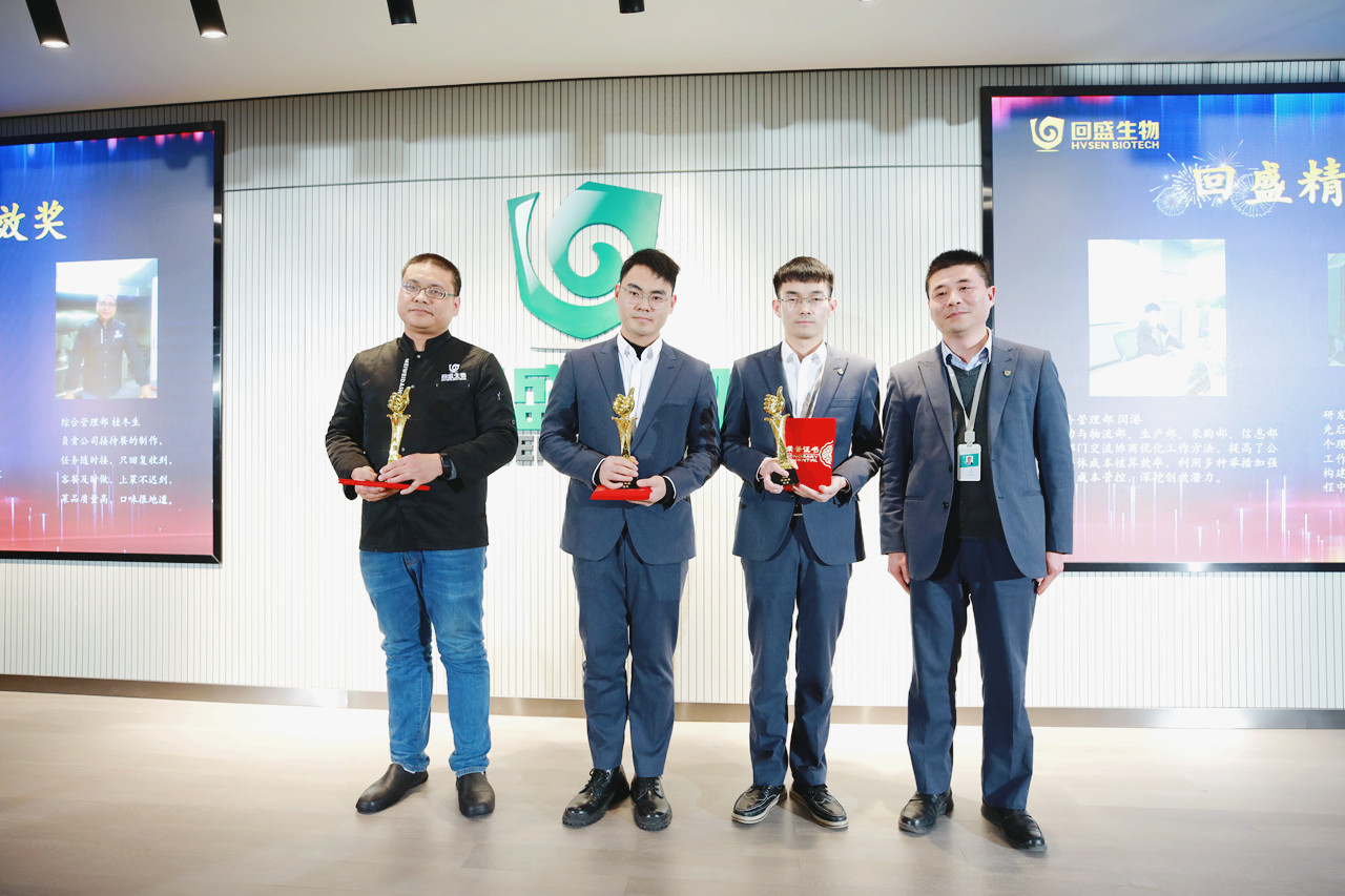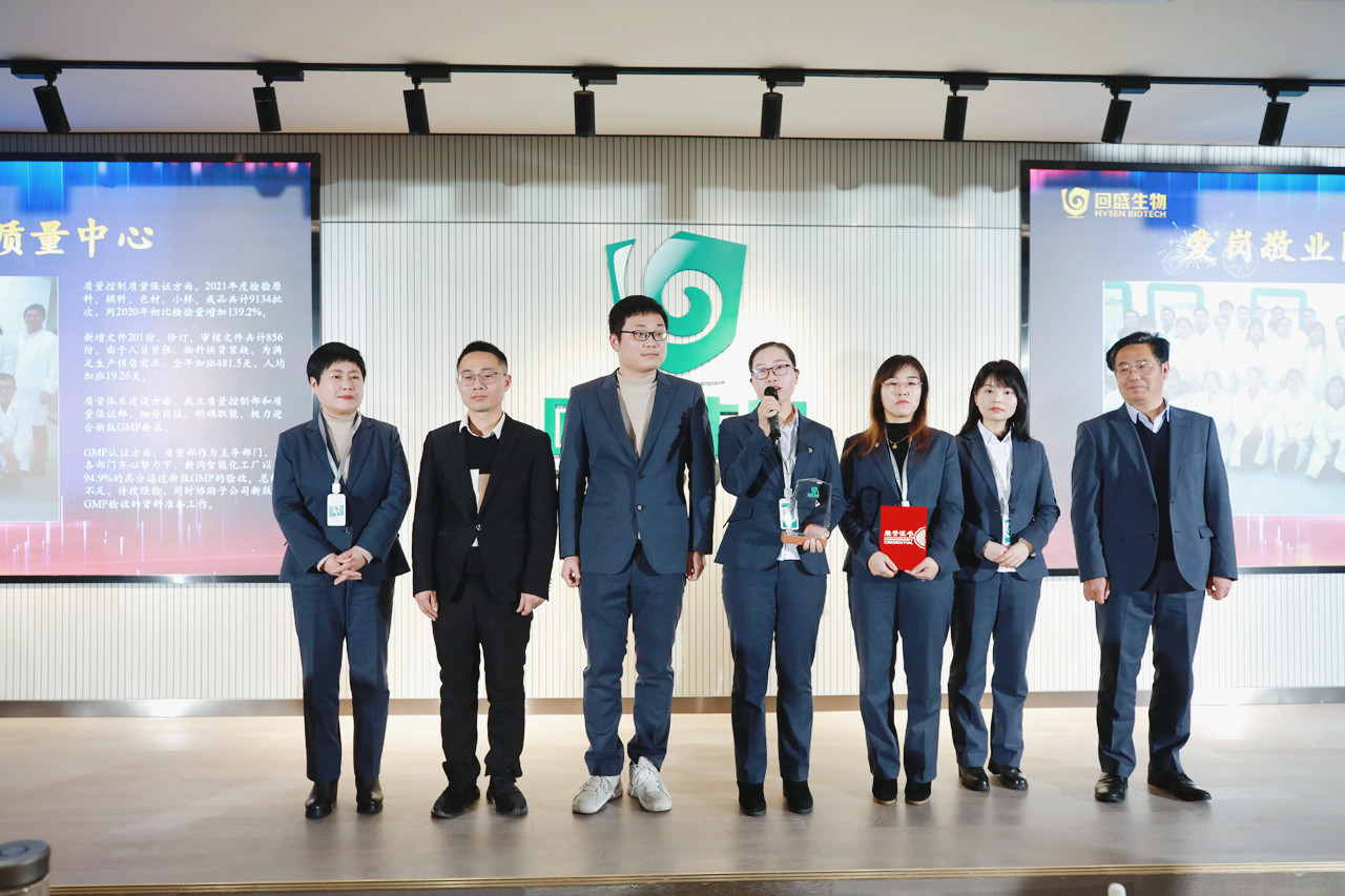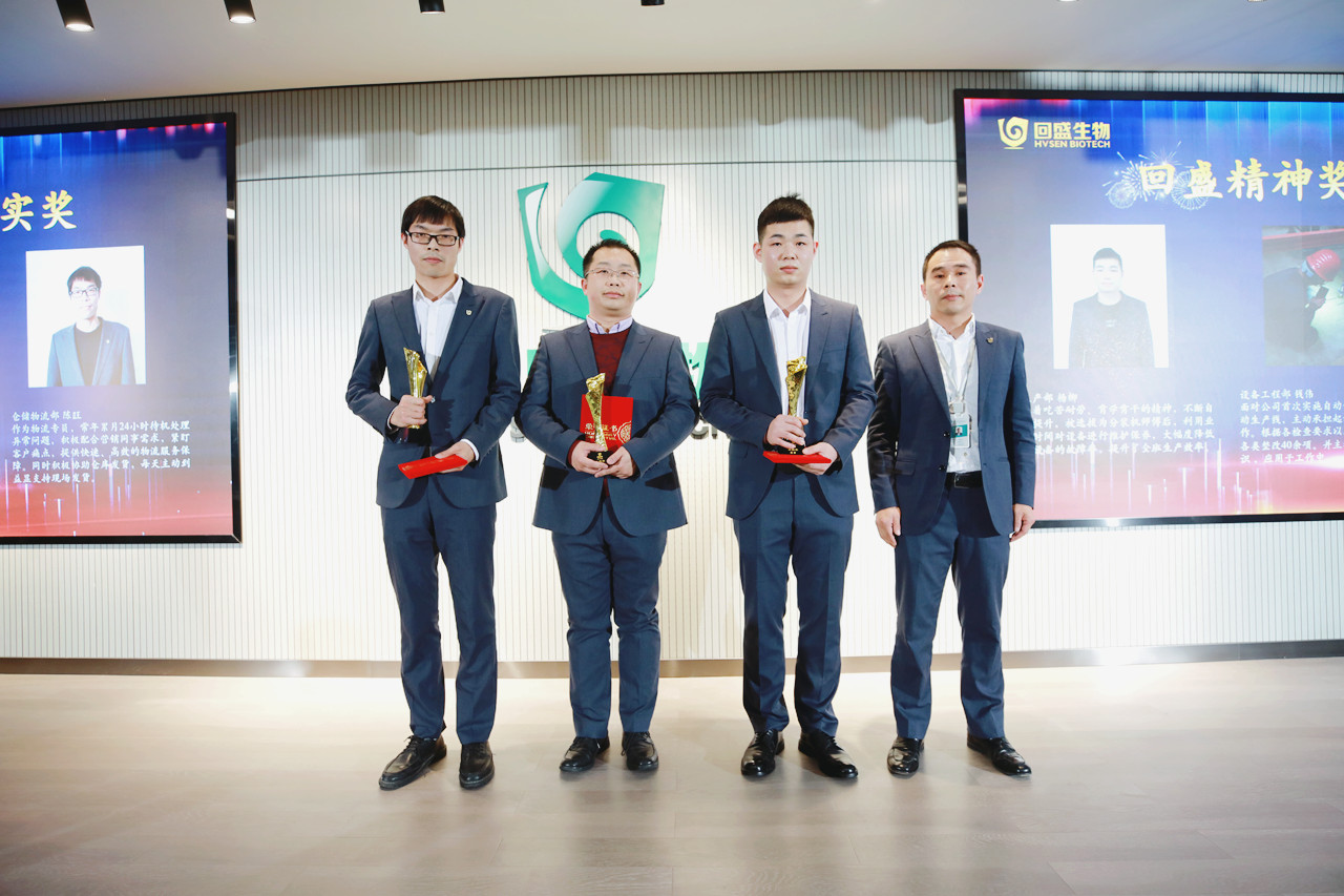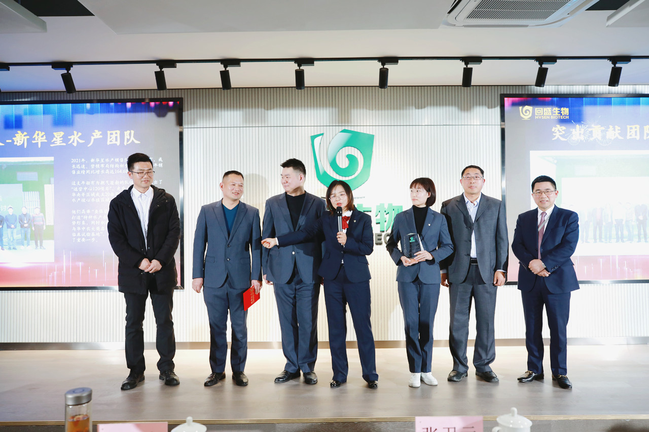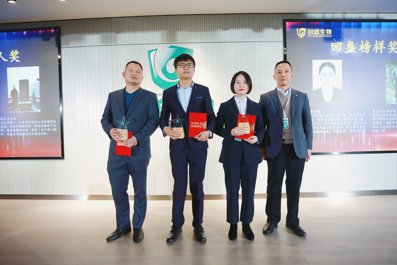 在觀看《開啟更好2022》新年祝福視頻后,大會對在2021年中取得優異成績和工作中表現突出的個人和團體進行了表彰。張衛元、李名家、李景中、劉潔等領導依次為銷售貢獻獎、回盛精神獎、回盛榜樣獎、回盛功勛獎榮譽稱號獲得者一一頒授證書、獎杯。