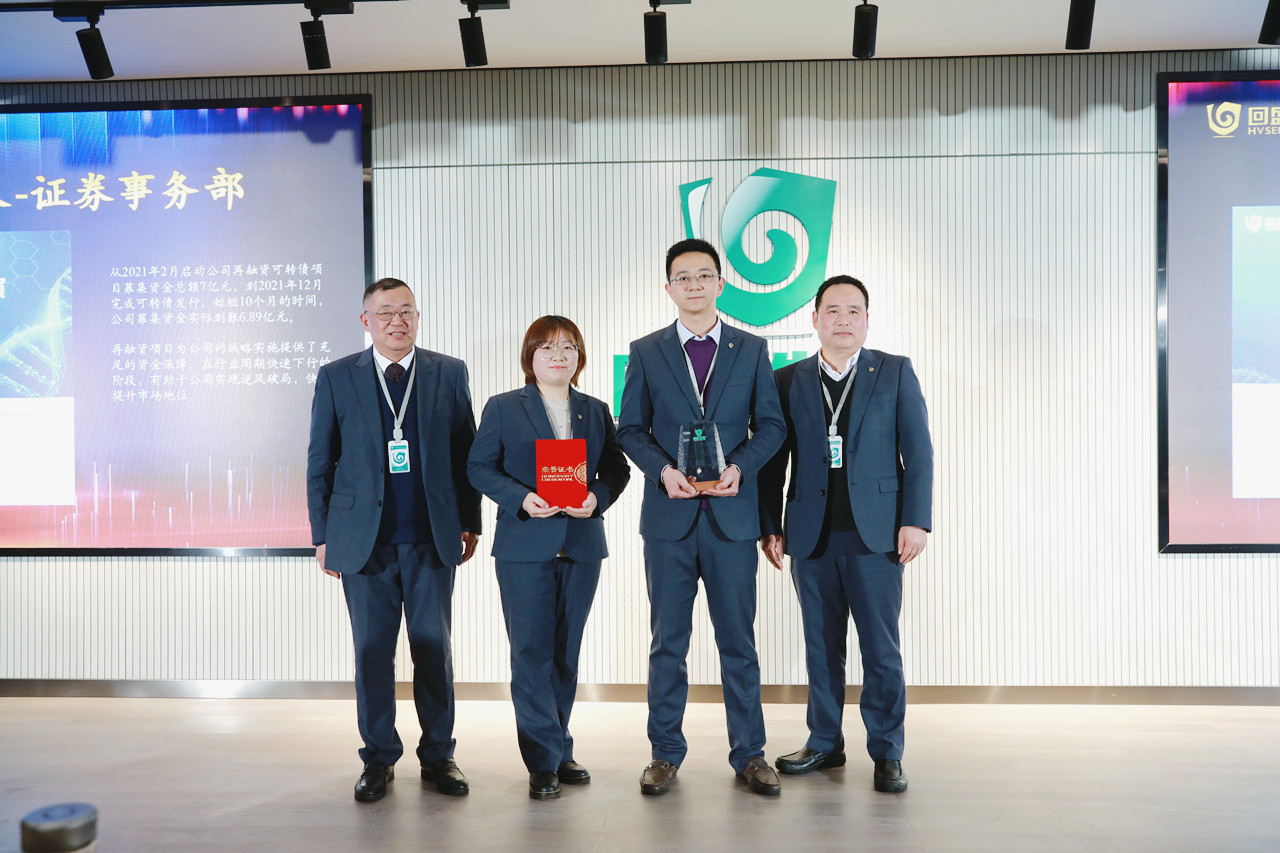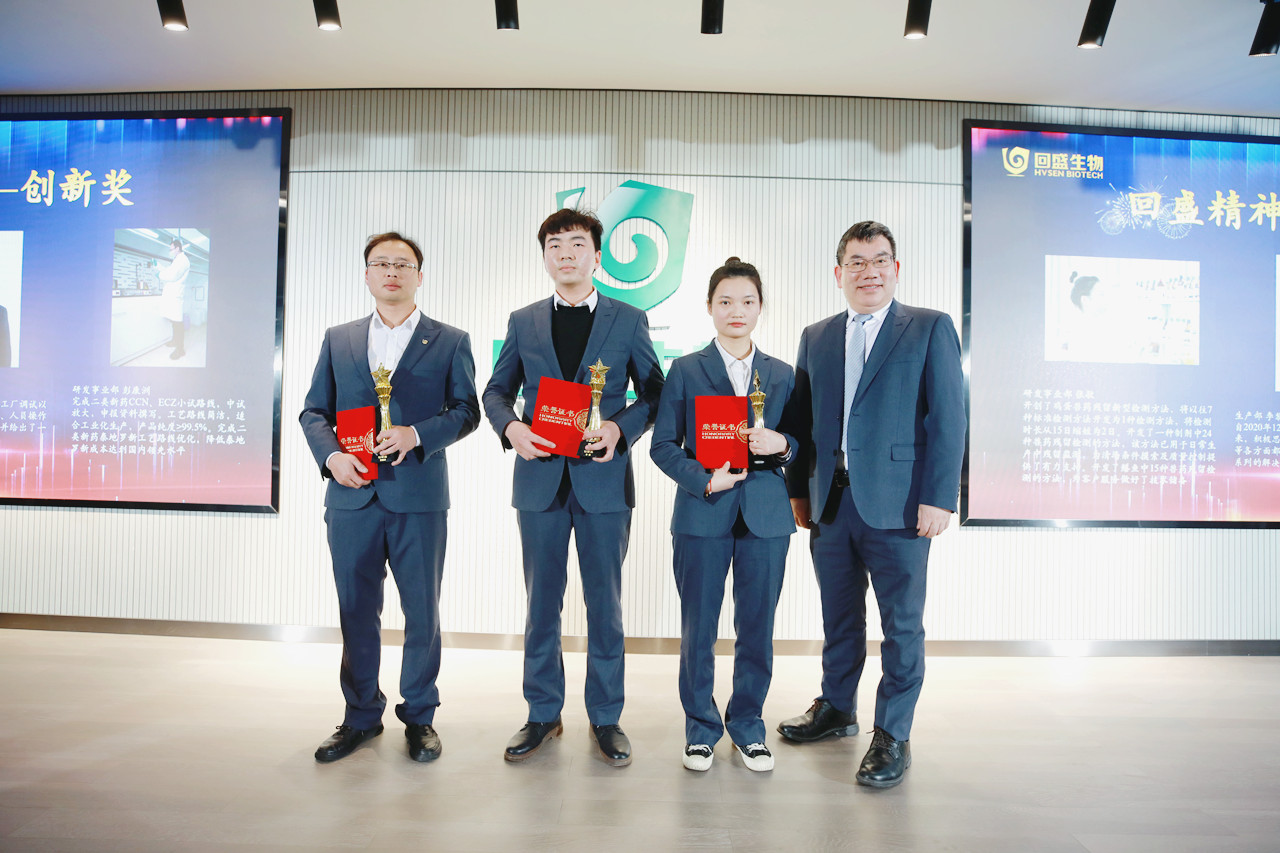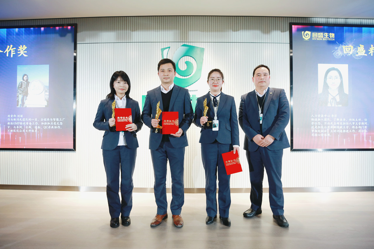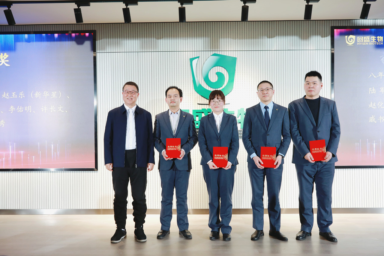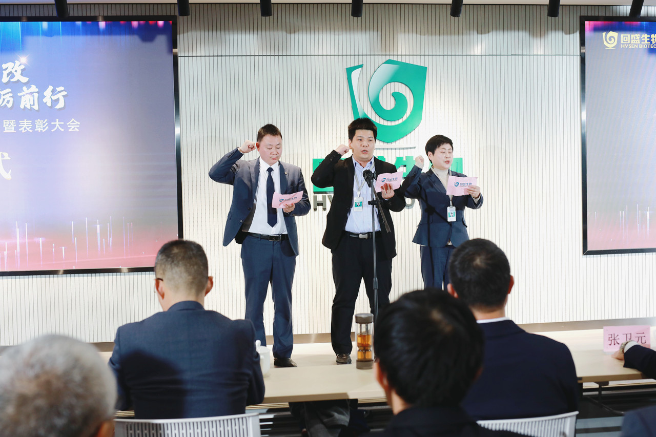 在觀看《開啟更好2022》新年祝福視頻后,大會對在2021年中取得優異成績和工作中表現突出的個人和團體進行了表彰。張衛元、李名家、李景中、劉潔等領導依次為銷售貢獻獎、回盛精神獎、回盛榜樣獎、回盛功勛獎榮譽稱號獲得者一一頒授證書、獎杯。